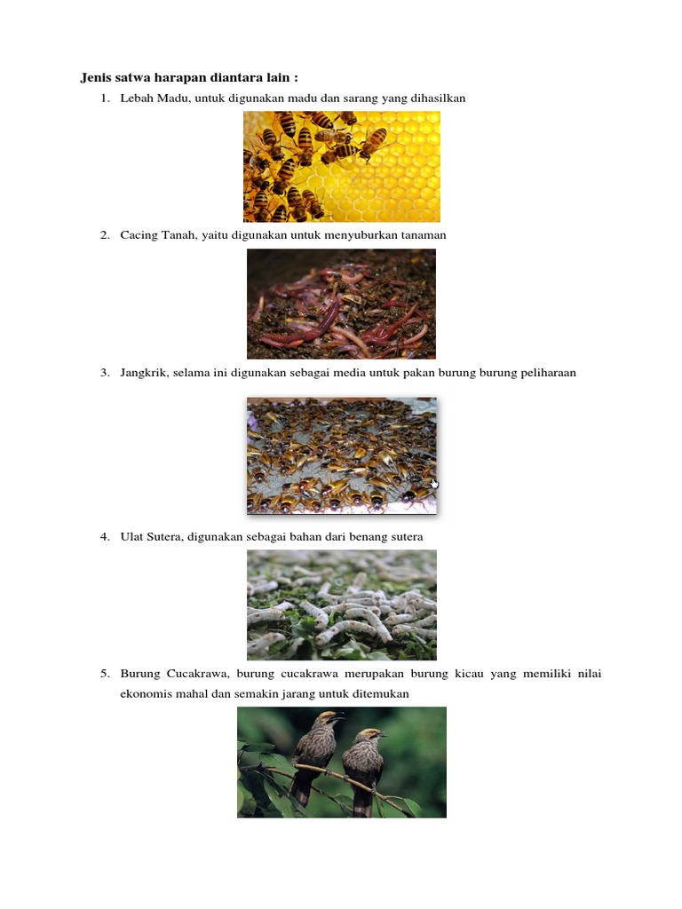 Dengan kata lain, satwa harapan merupakan satwa liar yang dapat memberikan manfaat ekonomis dan non ekonomis jika. Jangkrik, lebah madu, kroto, buaya, ular, burung puyuh, ulat sutera, belibis, cacing tanah, kambing Satwa harapan satwa harapan segala jenis hewan yang diharapkan mampu menghasilkan bahan baku, jasa, dan manfaat ekonomis maupun non ekonomis saat di pelihara atau di ternak. Cara pembudadayan jangkrik yang benar. Lalu jenis satwa harapan apa yang paling banyak dibudidayakan/dipelihara?